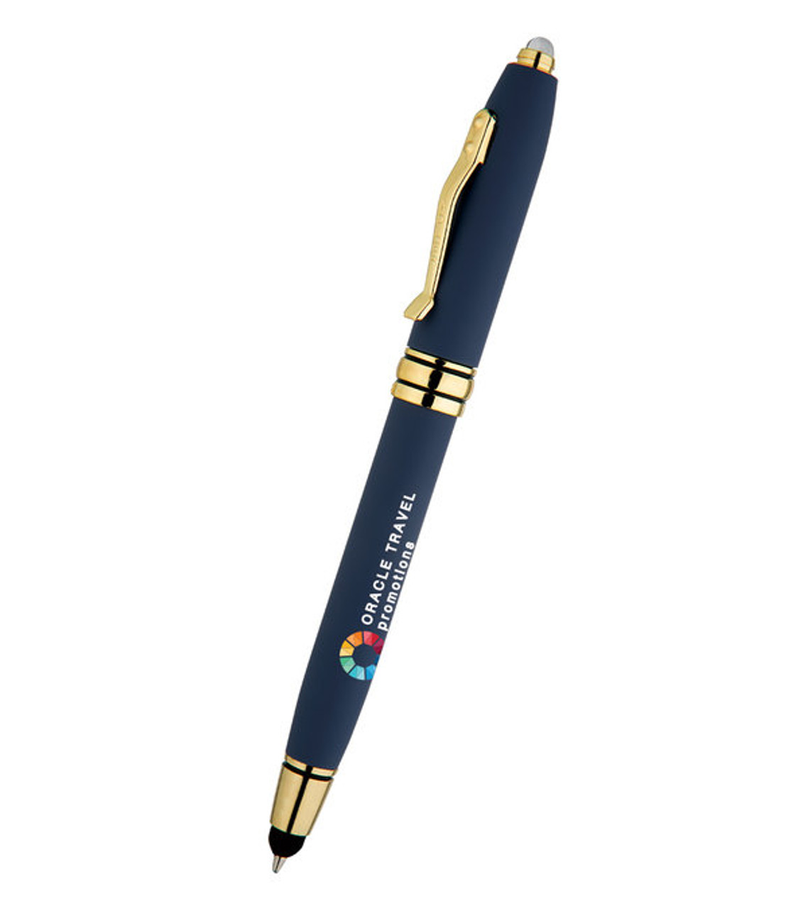 With a built-in touchscreen stylus and flashlight too, the Royale Tech Soft Touch Triple Function pen makes an excellent appreciation gift. Customers will love the way it looks and feels, and prospects will certainly admire it too. We’ll add your imprint in full-color on the soft-touch barrel so they never forget the brand behind this attractive giveaway.  Quality metal construction Rubber stylus at ballpoint tip Push-activated flashlight at the back end Includes 3 (LR41) button cell batteries (replaceable) Attractive gold-tone accents Twist-action retractable ballpoint Soft-touch finish on barrel Full-color digital decoration Item size: 5.31″ H Imprint area: Barrel Front/Back: 1.625″ W x 0.25″ H (full color) Cap Front/Back: 1.125″ W x 0.25″ H (full color) Imprint: Barrel Front/Back: 2 lines / 30 characters per line Cap Front/Back: 2 lines / 18 characters per line Imprint charges: $30.95 setup charge