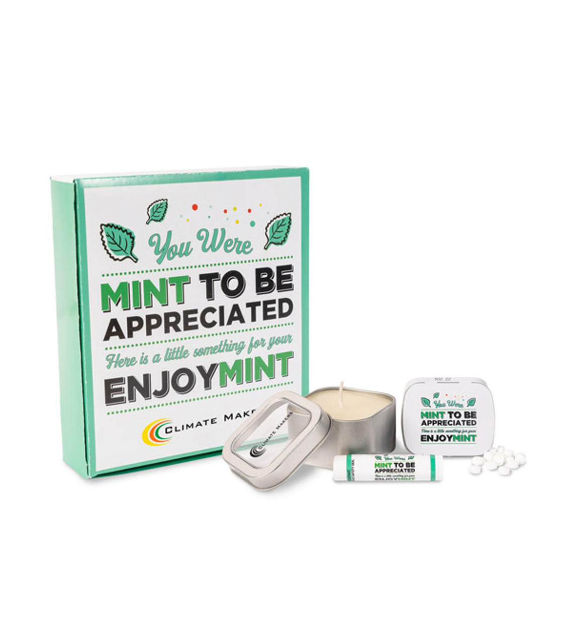 Show your appreciation for customers, employees or partners with the Scent-sational Mint Gift Box. It includes a quallity wax candle that smells like cypress when lit, a scent that’s been known to promote relaxation and rejuvenation. There’s also a box of mints and peppermint-flavored lip balm to moisturize their lips. Add this gift to employee appreciation days, team achievement celebrations, customer appreciation giveaways and more. It will show you canre and increase their satisfaction with your brand. Kraft gift box packed with: 4 oz. Cypress scented window tin candle, Domed tin filled with peppermint candies, Peppermint flavored lip balm Customization on box and candle only (Stock art on lip balm and mint tin) Full color digital decoration on box; Screen-printed decoration on candle Item size: Kraft box: 6.5″ W x 6″ H x 1.5″ D Imprint area: Box: 3″ W x 1.25″ H (4 colors max.) Top: 1.4″ W x 0.8″ H (1 color max.) Imprint: Box: 5 lines / 25 characters per line Top: 4 lines / 14 characters per line Applicable charges: $60.00 set up charge