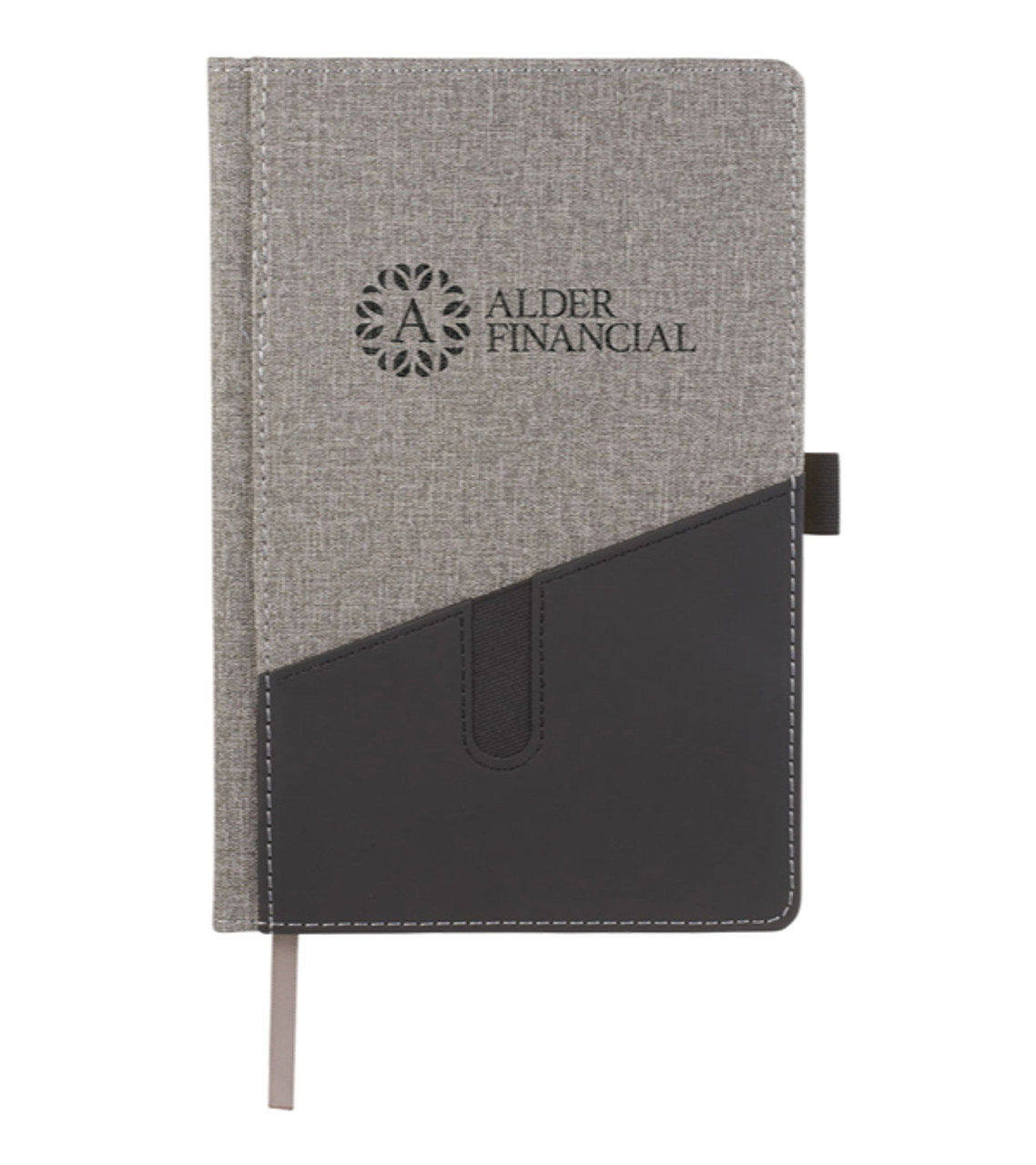 The front pockets on these journals create a striking color contrast and act as a handy place to stash documents or even phones. Your clients will appreciate the convenience of being able to carry papers and their favorite pen without using extra hands, bags or pockets. The paper in this notebook comes from well-managed, FSC®-certified forests. Heathered PU hard cover Front pocket for holding a smartphone, business cards or documents Elastic pen loop (pen sold separately) Back document pocket Ribbon page marker 80 sheets (160 pages) of FSC® Mix cream lined paper. Debossed imprint Item size: 8.4″ W x 5.7″ H Imprint area: Front: 3″ W x 2.75″ H Imprint: Front: 4 lines / 14 characters per line Imprint charges: $90.00 set up charge