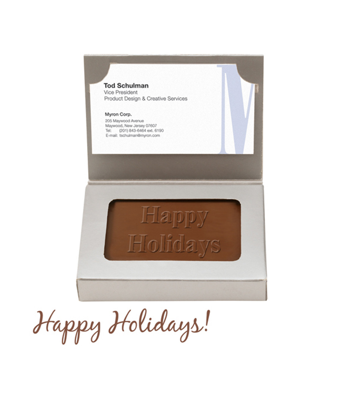 This chocolate gift box lets you distribute your business cards in the most clever and delicious way! Just insert your business card into the inside lid. Imprint your company identity on the exterior. Great for trade show giveaways or leave-behinds for client presentations. Hot Stamped imprint on the outside of the box. Milk or dark chocolate inside with “Happy Holidays” message. USA Made 1 oz. chocolate packed in elegant metallic gold or silver business card box Hot Stamp decoration Item size:3.75″ H x 2.5″ W x 0.5″ D Imprint area: 3″w x 2″h Imprint location: outside of the box Applicable charges: $65.00 chocolate set-up charge $0.40 run charge per piece In order to ensure the highest-quality delivery of your product, we use special insulated packaging and cool packs to protect chocolate orders from heat during warm weather months and/or when shipping to warm climates. Depending on your location, 2-day shipping may be necessary to preserve the quality of the products. Additional charges will be incurred. Please contact our Customer Service team for more information.