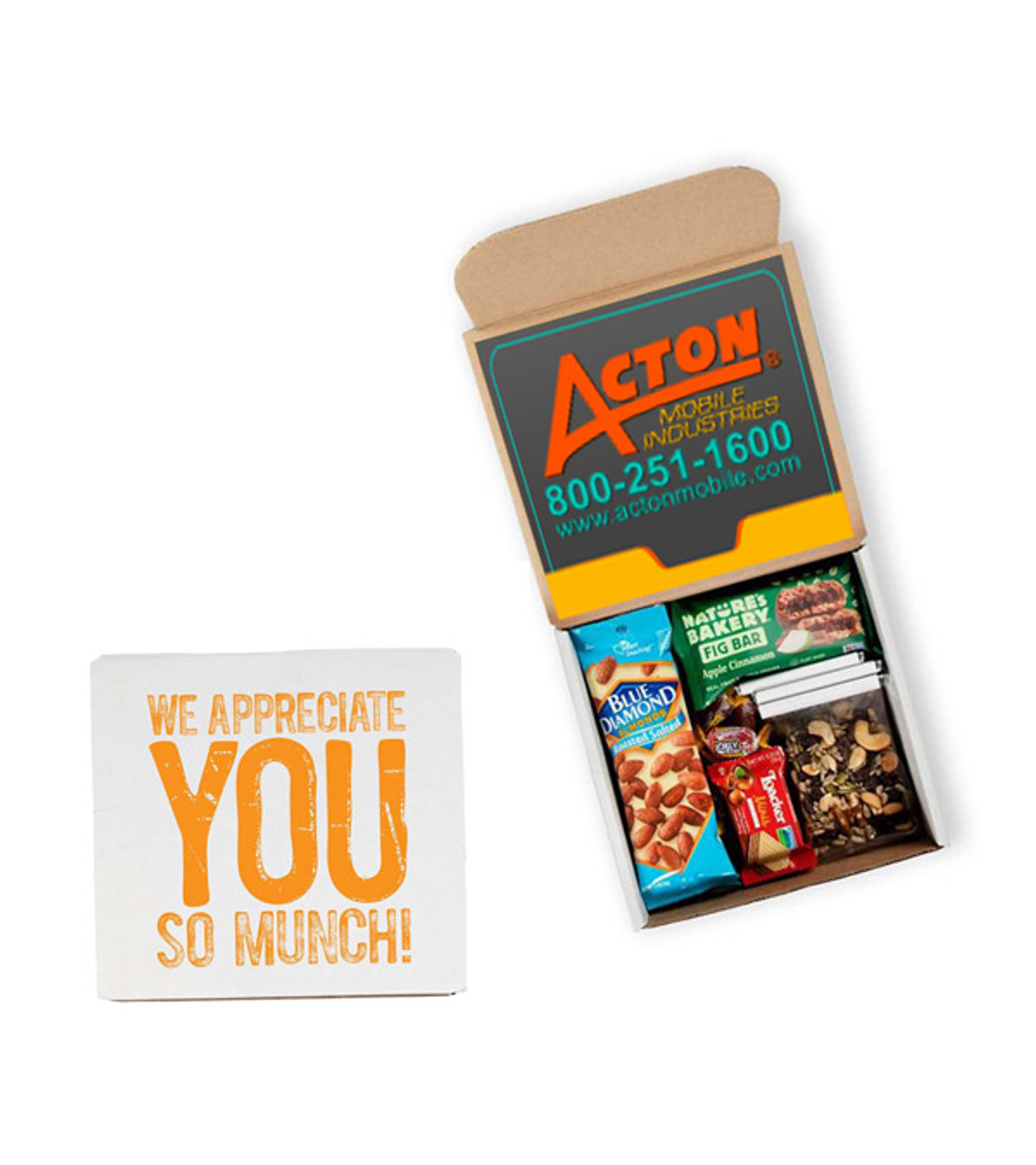 Celebrate the efforts of everyone on your team with the Small Snack Appreciation Box. Outside it tells recipients that they’re valued, while inside it’s filled with an assortment of treats, including trail mix, candies, chocolates and more. They’ll enjoy snacking on all the goodies this box contains, so it’s great on its own or in conjunction with another gift item. Great employee appreciation gift Includes chocolate bars, almonds, trail mix and more Two stock design options: healthcare or non-healthcare 10 Assorted Jolly Ranchers 3 Mini wafers 3 Chocolate bars 3 Roasted and salted almond bags 3 Fig bars 3 Bags of raisin nut trail mix Ideal for on-site or remote staff members Full color digital label decoration inside box lid Item size: 7.3125″ W x 2.9375″ H x 8.1875″ L Imprint area: Label: 8″ W x 6″ H (full color) Imprint: Label: 2 lines / 60 characters per line Applicable charges: $60.00 set up charge