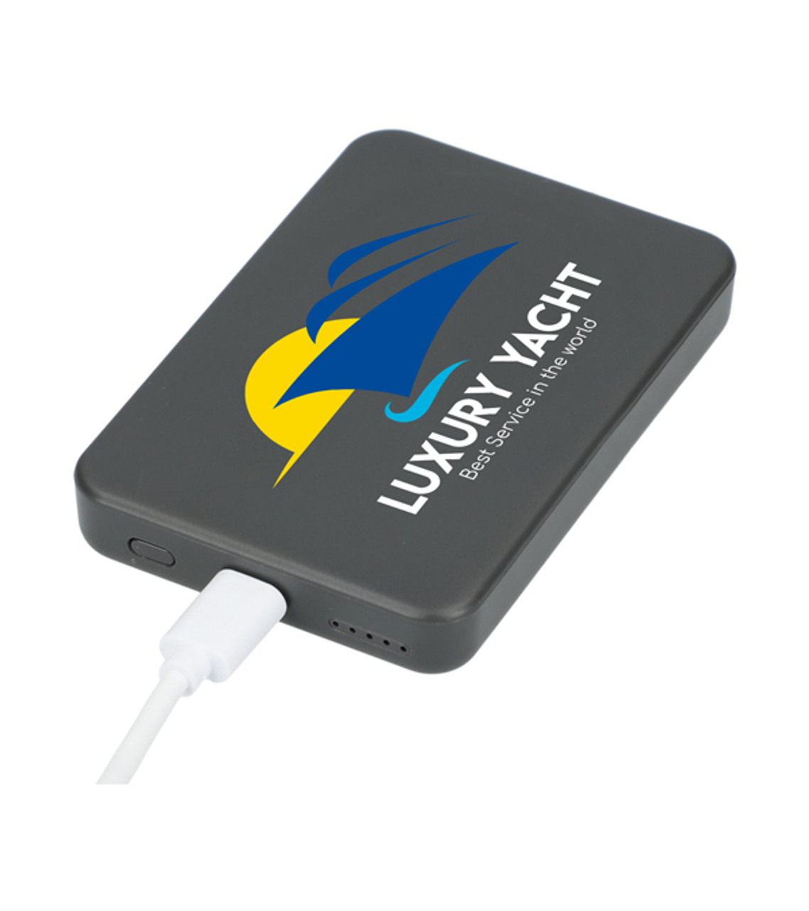 Embrace the future of charging with the SoleKick MagClick 5000mAh Wireless Power Bank. It’s not just a power bank; it’s your ticket to a life without charging hassles. Stay charged, stay connected without limits. 5000 mAh Wireless Power Bank Rechargeable lithium polymer battery (18.5Wh) iPhone 12/13/14 models can be attached magnetically for wireless charging Supports 5W wireless charging for most newer devices Type C Input/Output: 5V/2.1A Works with any smartphone or tablet even ones without wireless technology Includes a 31-inch USB-A-to-Type-C charging cable Packaged in a FSC certified premium gift box Full Color Imprint Item size: 1.39″ W x 2.9″ H x 0.5″ D Imprint area: Top: 0.75″ W x 0.63″ H (full color) Imprint: Top: 6 lines / 12 characters per line Applicable charges: $100.00 set up charge