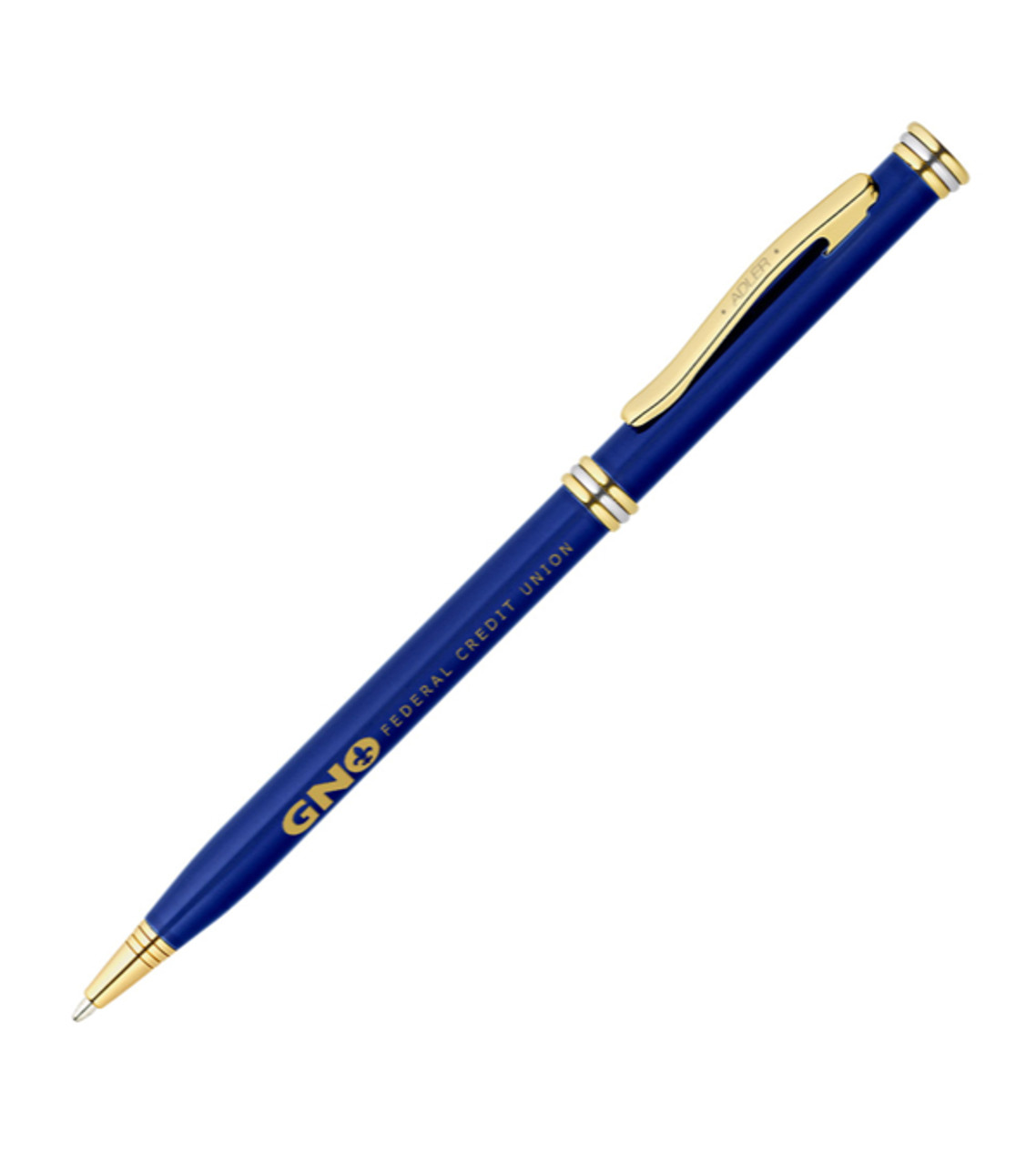 The thinly contoured Sovereign ballpoint pen is the king of custom pens! Featuring your decorated imprint elegantly on the barrel, this pen also boasts rich appointments with a gleaming enamel finish and twist-action convenience. The brass body makes for a truly memorable promotional giveaway. Quality Brass construction Gleaming enamel finish with rich gold-tone accents Twist-action retractable medium ballpoint Metal clip Laser engraved so your imprint won’t rub off or fade Item size: 5.3″ L Imprint area: 1.25″ W x 0.2″ H Imprint: 2 lines / 27 characters per line Applicable charges: $24.95 set-up charge