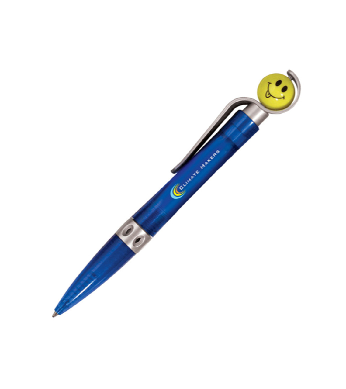 Win smiles and make friends with your full-color imprint on our adorable Spinner Smiley Pen! The fun design and convenient click-action function makes this promotional ballpoint ideal for an upbeat, all-occasion giveaway! Smiley face spins at top of pen A different smile on each side Satin silver finish clip and accents Click-action retractable medium ballpoint ABS plastic Full-color digital decoration Item size: 5.62″H Imprint area: 1.5″ W x 0.375″H (Full Color) Imprint: 3 lines / 22 characters per line Imprint charges: $15.00 set up charge