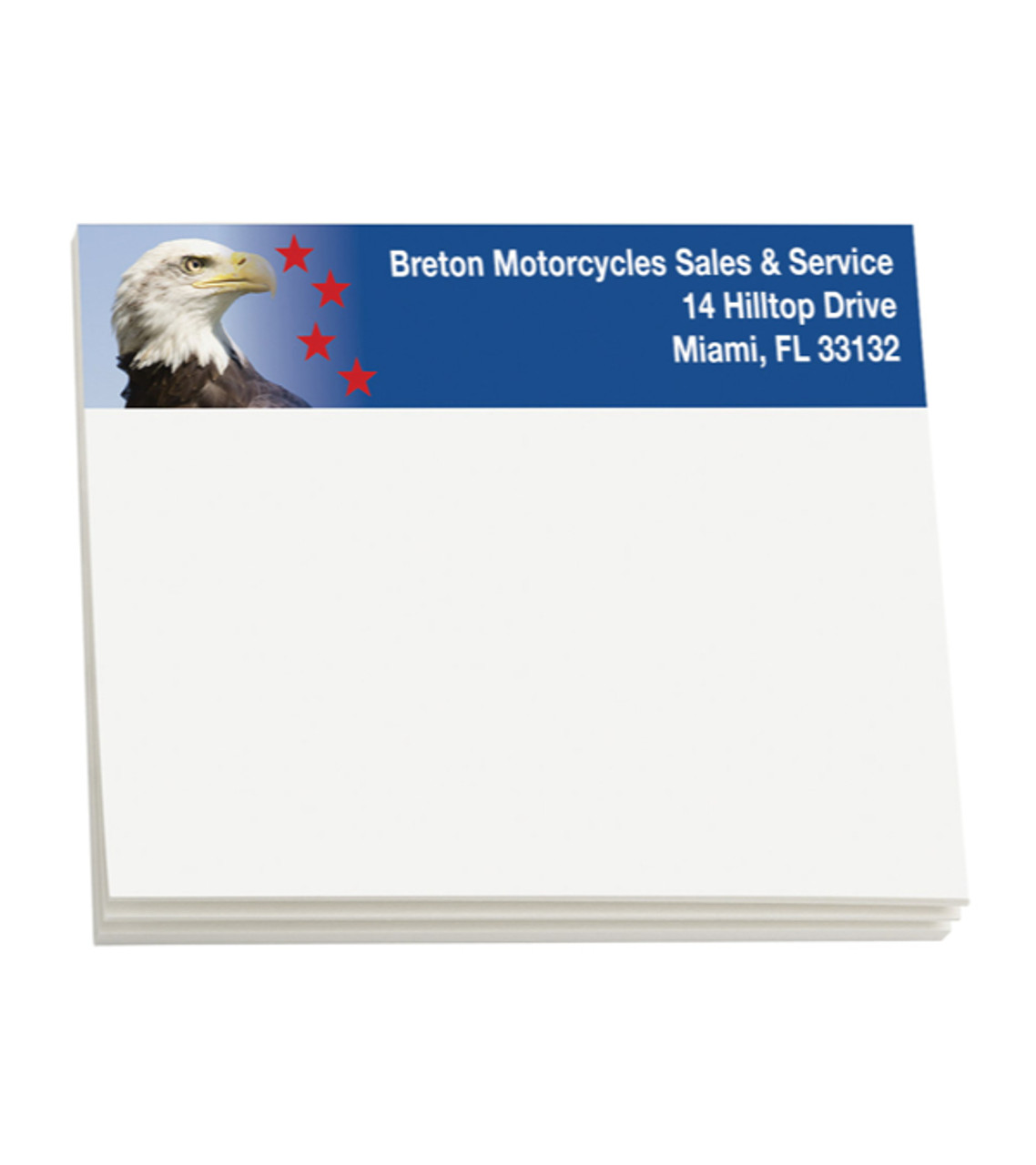 Customer appreciation will soar when you present them with this imprinted American Eagle Sticky Note pad! Send us your full-color logo or artwork and we’ll print it on every page at no extra charge! Proudly made in the USA. 25 sheets per pad. Want to use your own design? You can create a unique custom sticky note pad at no extra charge. For more information call our Customer Care team at 1-877-803-3358. Item size: 4″ W x 3″ H Imprint area: 1 side: 2.375″ W x 0.75″ H Imprint: 4 lines / 35 characters per line Applicable charges: $25.00 set up charge Please Read Before Placing Your Order Please note that orders for this product must be placed in exact quantities of 250, 500, 1000, or 1500. Any order over the first 500 units must be placed in increments of 500. If an order is placed that is not an exact quantity as described, we will contact you.