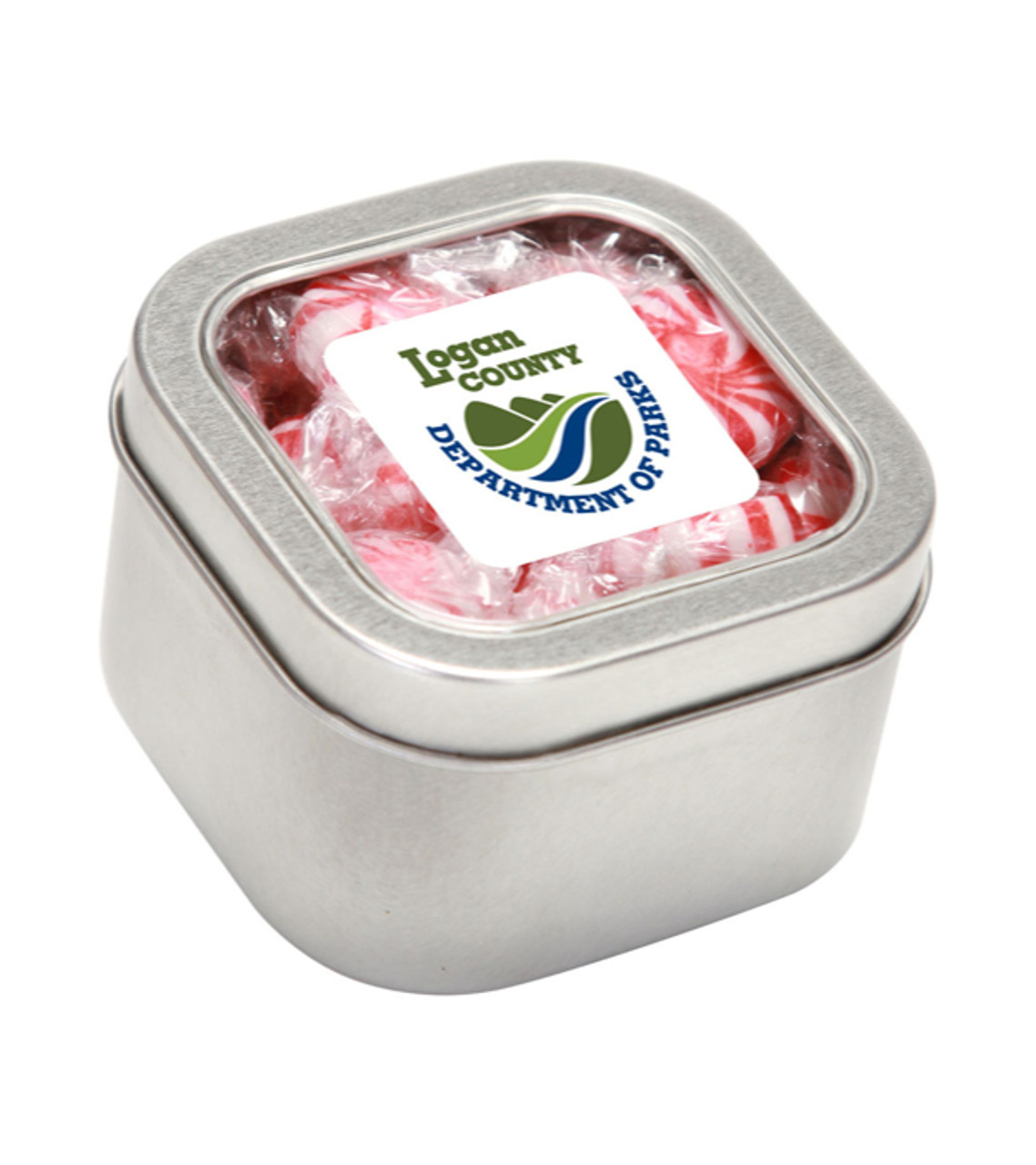 Earn your stripes at trade shows and community events with this refreshing gift. We’ll add your logo to the reusable window tin, so customers will see your brand name again and again. Square tin with clear lid Contains 5 oz. peppermints 4-color process digital decoration Item size: 3″ W x 2″ H x 3″ D Imprint area: Top: 2″ W x 1.5″ H (full color) Imprint: Top: 6 lines / 16 characters per line Applicable charges: $60.00 set up charge During warmer weather months perishable items may require special packaging and shorter shipping transit times. Additional charges will be incurred. Please contact our Customer Service team for more information.