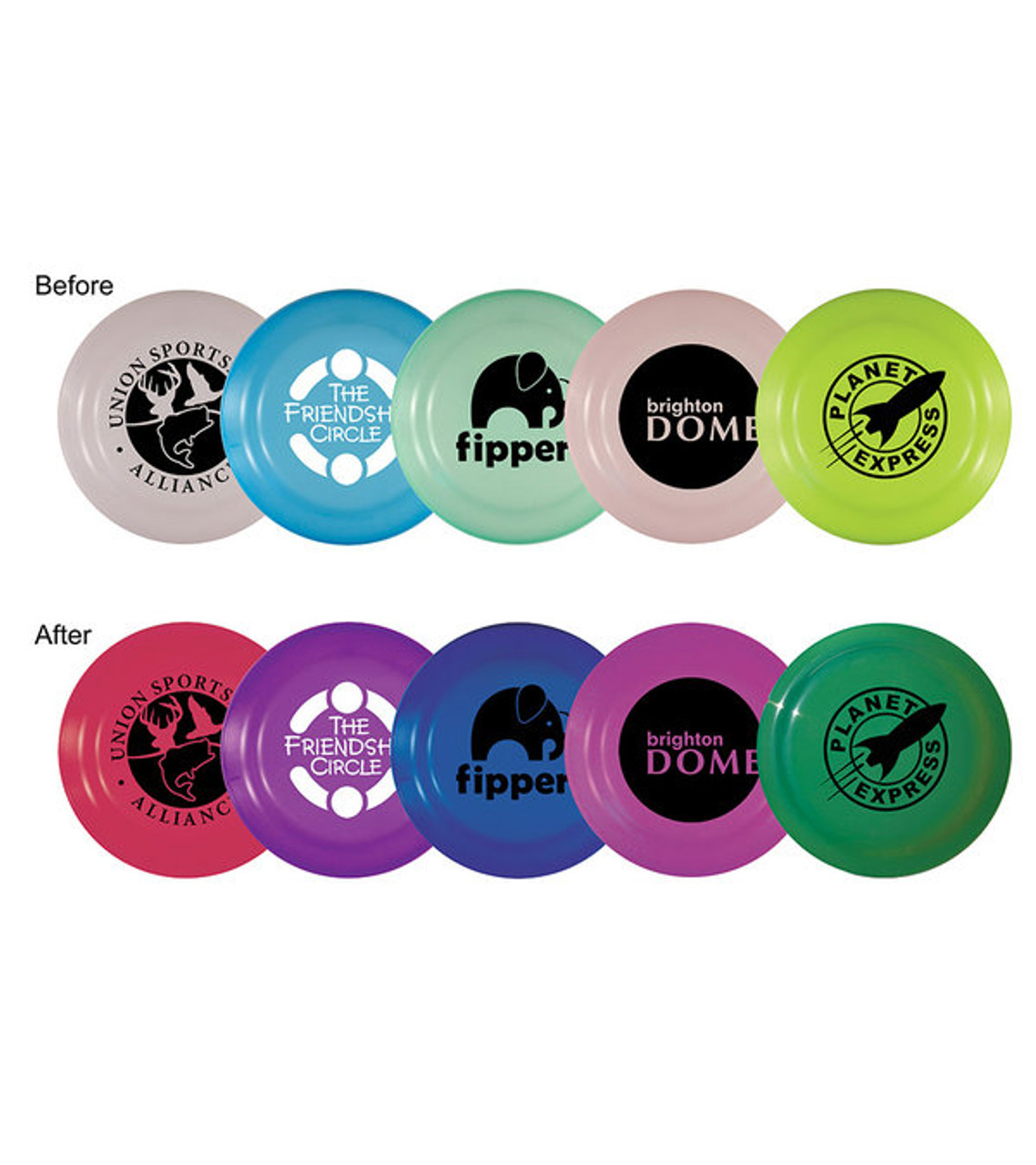 Put a fresh spin on your marketing strategy with Myron’s promotional Sun Fun Value Flyer. Changes color in the sunlight Available in assorted colors Made in the USA Item size: Frisbee: 9″ Dia. Imprint area: Front: 5 1/2″ Dia. (1 color max.) Imprint: 6 lines / 20 characters per line Applicable charges: $65.00 set up charge