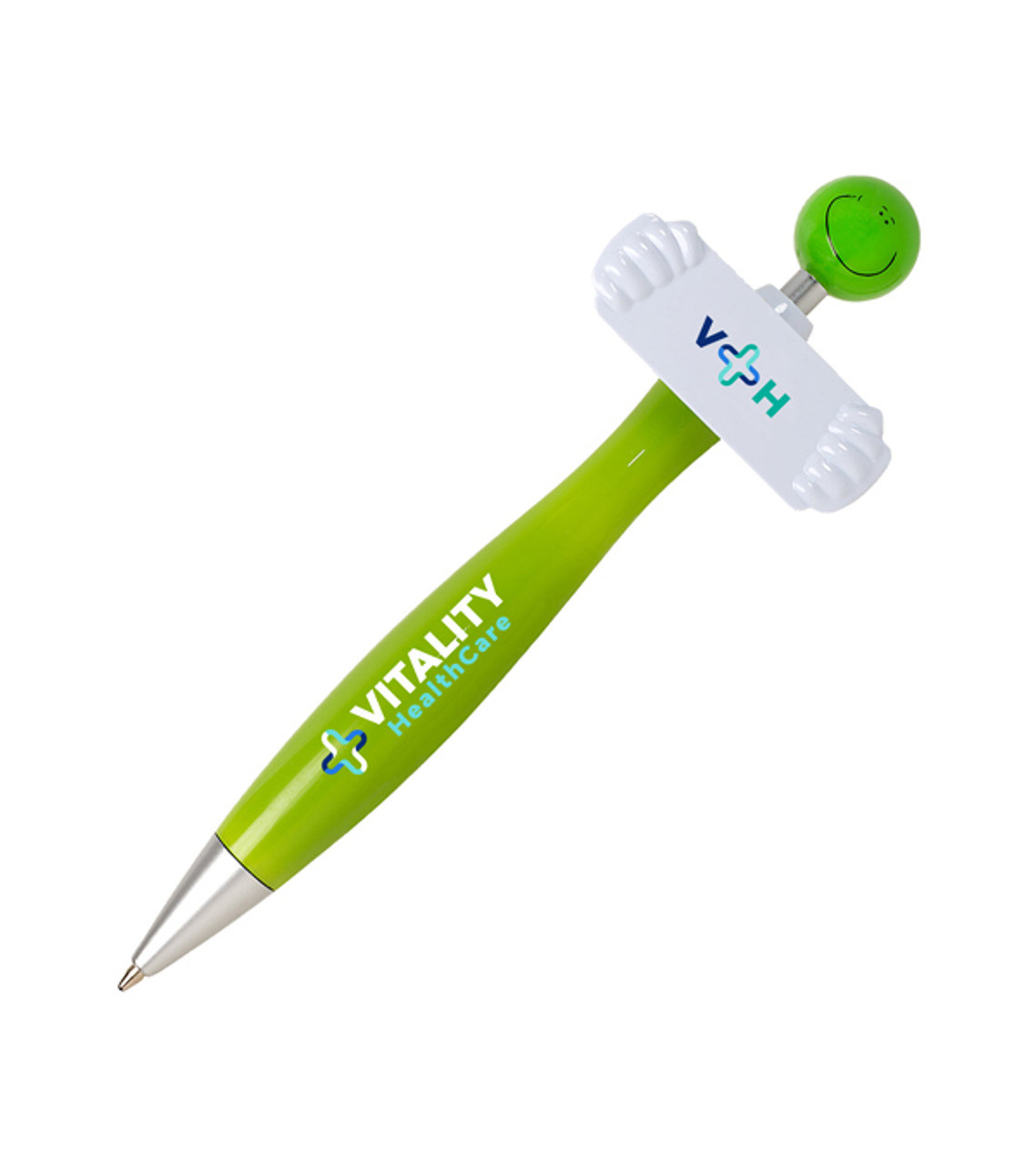 Introducing our Click-Action Ballpoint Pen: a cheerful and functional writing instrument designed to bring a smile to your face. ABS Plastic click-action ballpoint pen Smiling cap and white sign Includes black medium point ink Pad-printed decoration Item size: 5.4″ H x 0.58″ Dia. Imprint area: Barrel front/back: 1.375″ W x 0.315″ H (2 colors max.) Imprint: Barrel front/back: 3 lines / 20 characters per line Imprint charges: $35.00 set up charge $0.25 per pc per additional color / location