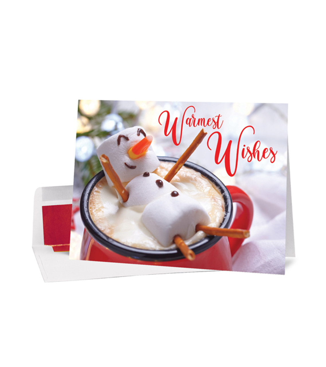 The Sweet Holiday Greetings Christmas Card is a wonderful way to enhance your seasonal promotions and make your business remembered. It features the fun image of a marshmallow snowman relaxing in a cup of hot cocoa, alongside a message from your company to remind recipients that you care. Add this card to your end-of-year campaign, employee holiday gifts, or any other seasonal initiative to help get the results you desire. Paper card Includes choice of greetings Standard foil-lined envelopes Foil stamped decoration Item size: 7.875″ W x 5.75″ H Imprint area: Card inside: 5.375″ W x 4.375″ HÂ (1 color max.) / Envelope: 1.06″ W x 0.17″ H (1 color max.) Imprint: Card inside: 5 lines / 37 characters per line Envelope: 3 lines / 32 characters per line Imprint charges: $24.95 set up charge Return address on envelope $24.95 set up charge plus $.10 per pc Click here to view our Standard Holiday Card Greetings!