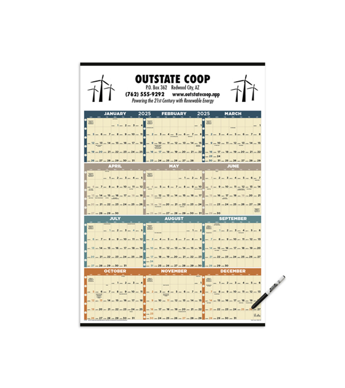 The laminated Time Management Span-A-Year Calendar with dry erase marker included is a useful business gift that helps them keep up with appointments, projects, meetings and more. Users can write on it and wipe it clean as needed for easier everyday planning. This is a wonderful way to get your business imprint seen daily. Calendar is made in the USA of FSCĀ® 100# gloss paper Grid colors for easy viewing Grid include Julian dates Dry erase marker included; however they ship bulk in box (not attached to the calendar) Laminated surface is easy to write on/wipe clean Large imprint area Materials used for this product come from well-managed FSCĀ®-certified forests and other controlled sources Offset printed decoration Item size: 27″ W x 38″ H Imprint area: Front: 26″ W x 5.5″ H (1 color max.) Imprint: Front: 10 lines / 97 characters per line Imprint charges: FREE set up