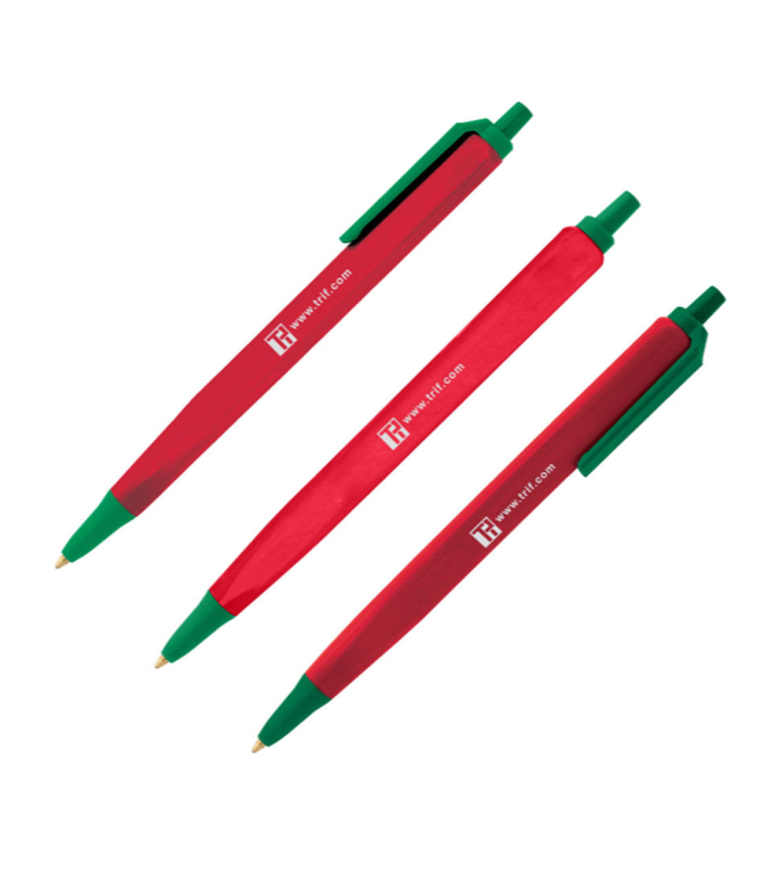 Customize the Red Tri-Stic Promo Pen for a more powerful promotion! The three-sided, red barrel gives you a bold, spacious backdrop for your message. The tip, pocket clip, and convenient click-action plunger, are all color-coordinated for extra eye-catching appeal. Choose from a variety of accent colors to get the perfect look for your brand! PP Plastic Click-action retractable medium ballpoint Three-sided, red barrel Tip and matching clip available in a variety of colors Screen-printed decoration > > Blue > Green > White > Black > Red Item size: 5.10″ L x 0.5″ Dia Imprint area: Barrel: 3″ W x 0.21″ H (1 color max.) Clip: 1.12″ W x 0.15″ H (1 color max.) Imprint: Barrel: 2lines / 44characters Clip: 1 line / 18 characters Applicable charges: $24.95 set up charge $0.10 per piece per additional location