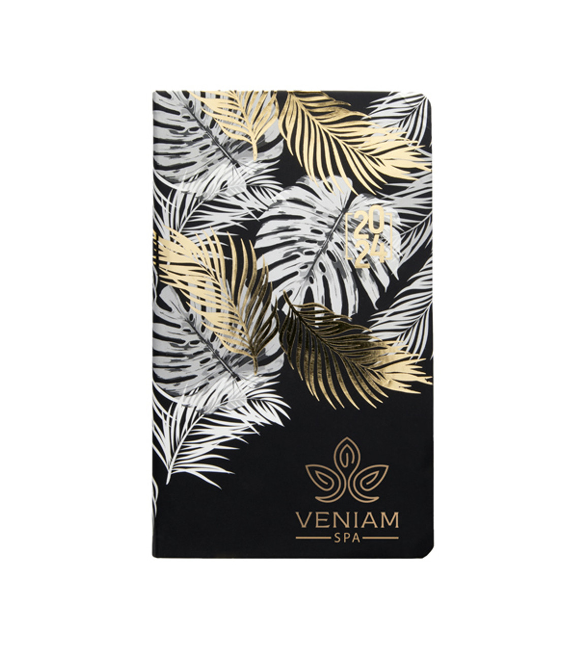 The Tropical Bliss Hard Cover Pocket Pal helps customers and employees stay on top of their appointments, meetings and other calendar events all while getting attention on your gold foil imprint every day. A wonderful gift with onboarding swag, at conventions, or during appreciation events, this custom pocket calendar will give your business the boost you’re looking for. Weekly view calendar for easy organization Compact size for portability Gold foil tropical leaf print 144 Pages Weekly Quotes US/CA Holidays & Observances US/CA Time Zone Map International Calling Codes International Times Address/Phone Numbers Birthdays & Anniversaries Keyboard Shortcuts Gift Ideas US State Facts Metric Conversion Chart CPR & First Aid Instructions NextYear Advance Planning Toll Free Numbers and Websites Colorful World Map Foil stamped decoration Item size: 3.5″ W x 5.8″ H x 0.03″ D Imprint area: Front: 1.75″ W x 1″ H (1 color max.) Imprint: Front: 4 lines / 22 characters per line Imprint charges: $24.95 set up charge